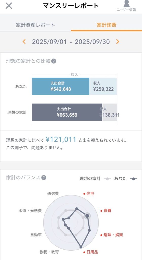 ・「家計診断」は、理想の家計より「¥121,011 支出を抑えられている」の評価となりました。