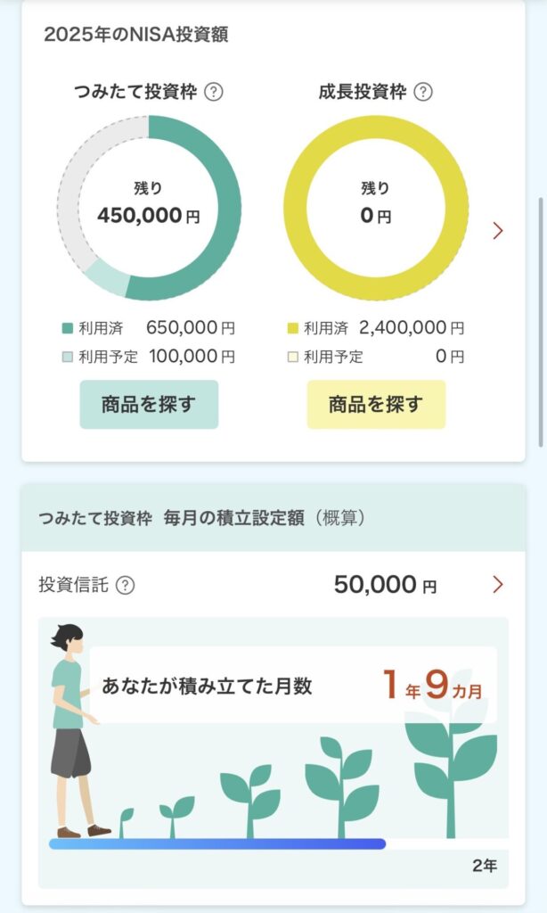 ・現在、毎月5万円を半割合ずつ、上記2銘柄で積立て設定中。(上記は、私の積立NISA画面ですが、「配偶者枠」も別途同様に、毎月5万円の利用設定中です。)