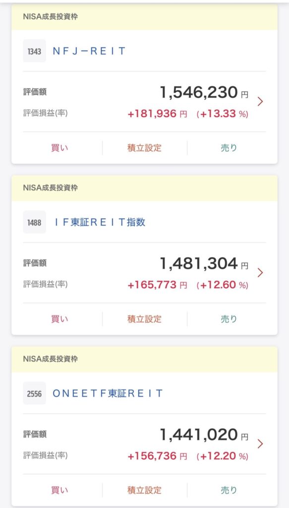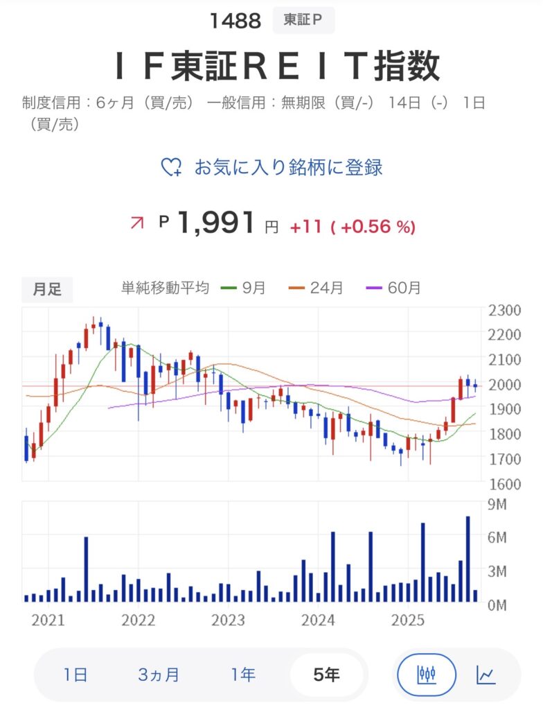 ・上記は、「IF東証REIT指数(1488)」ですが、現在は、2024年末辺りから「右肩上がり」のチャート推移となっており、半戻しの状態ですね。