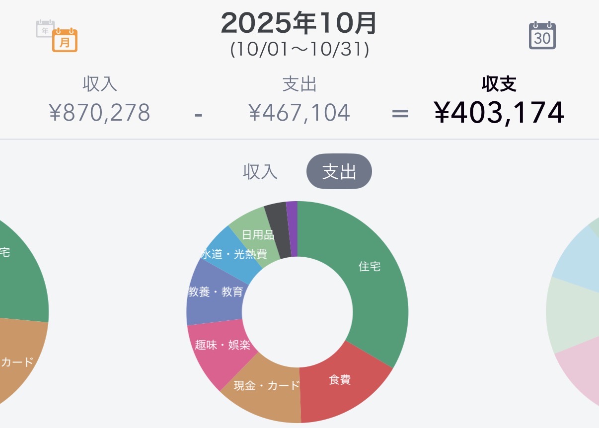 ・直近10月末〆(個人)、家計簿仕分け集計でました。(配偶者側、別会計。)