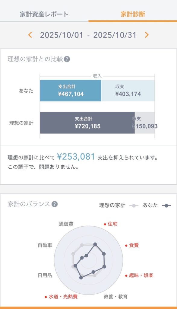・「家計診断」は、理想の家計より「¥253,081 支出を抑えられている」の評価となりました。