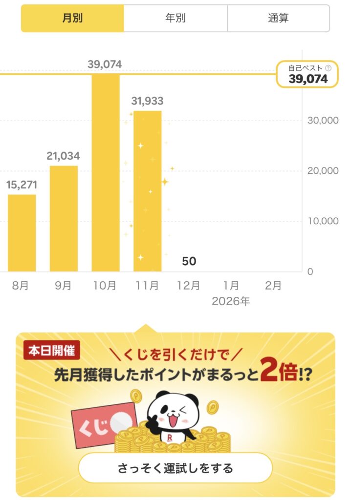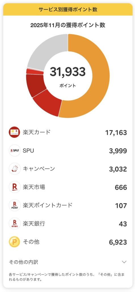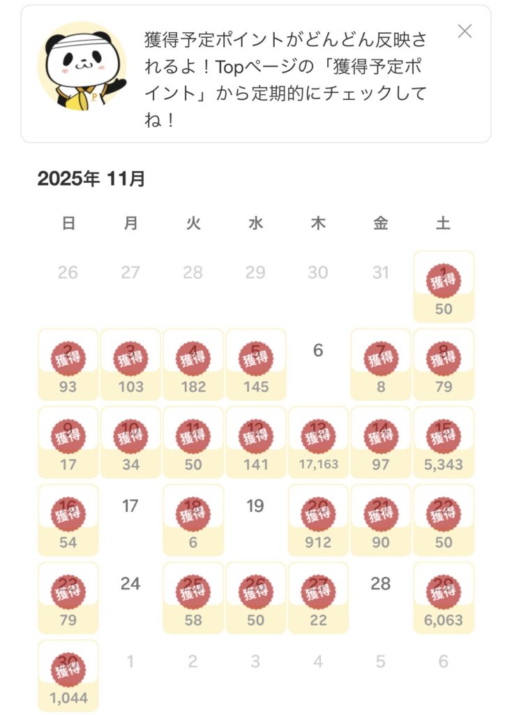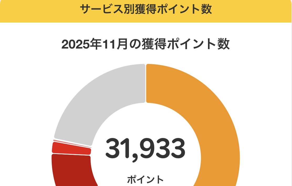 ・2025年11月は、「31,933ポイント」の合計獲得となり、前月比でややダウンのポイント獲得となりましたね。